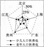 解析 由图可知,贵州的少儿人口抚养比最大,其他各省市由大到小依次是广东、江苏、北京、上海;广东的老年人口抚养比最小,上海的最大。