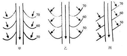 解析 潜水等水位线上的等值线向数值大的方向凸出,说明河流水位低于潜水水位,则潜水补给河水;相反,河流水位高于潜水水位,河水补给潜水。图中,甲为潜水补给河水,乙为河水补给潜水,丙为右岸潜水补给河水,左岸河水补给潜水。