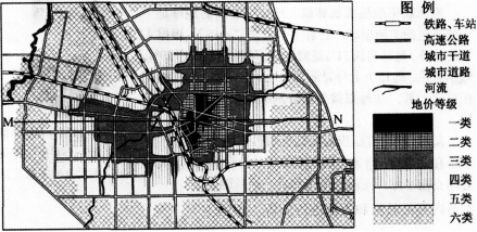 解析 图中M—N一线地价等级变化与沿线经过的地价等级有关,一类等级地价最高,六类等级地价最低,从M到N依次对照地价等级图例可知C项符合。