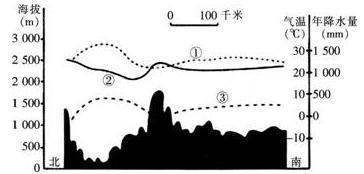 解析 图中地势最高处对应的气温值应较两侧低,而三条曲线中唯有②在该处升高,说明①③表示的是气温曲线,7月气温自然要高于1月,故①②③分别表示七月均温、年降水量和一月均温线。