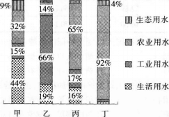 解析 根据农业用水量比重最低,判断乙为上海;农业用水量比例最高的为丁,判断为新疆;生活用水量占比重最高的为甲,判断为北京。