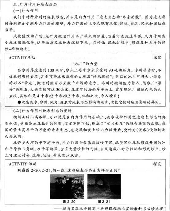 阅读关于“外力作用和地表形态”的图文资料,按要求完成教学设计任务。 材料一《普通高中地理课程标准(实验)》中的内容标准要求:“结合实例,分析造成地表...
