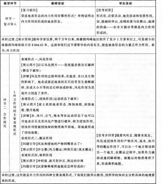 问题 阅读关于“外力作用和地表形态”的图文资料,按要求完成教学设计任务。 材料一《普通高中地理课程标准(实验)》中的内容标准要求:“结合实例,分析造成地表形态变化的内外力因素。” 材料二某版本教科书中关于“外力作用和地表形态”的相关内容。 要求: (1)写出本课的知识组成。(9分) (2)根据课程标准和教材的知识组成,设计教学过程要点(应包括教师、学生的活动方式和活动内容)。(15分)