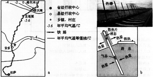 问题 阅读图文材料,完成下列要求。 多年冻土分为上下两层,上层为夏季融化,冬季冻结的活动层,下层为多年冻结层。我国的多年冻土主要分布于东北高纬度地区和青藏高原高海拔地区。东北高纬地区多年冻土南界的年平均气温在-1~1℃,青藏高原多年冻土下界的年平均气温约为-3.5~-2℃。 由我国自行设计、建设的青藏铁路格(尔木)拉(萨)段成功穿越了约550千米的连续多年冻土区,是全球目前穿越高原、高寒及多年冻土地区的最长铁路。多年冻土的活动层反复冻融及冬季不完全冻结,会危及铁路路基。青藏铁路建设者创造性地提出了“主动降温、冷却路基、保护冻土”的新思路,采用了热棒新技术等措施。图a示意青藏铁路格拉段及沿线年平均气温的分布,其中西大滩至安多为连续多年冻土分布区。图b为青藏铁路路基两侧的热棒照片及其散热工作原理示意图。热棒地上部分为冷凝段.地下部分为蒸发段。当冷凝段温度低于蒸发段温度时,蒸发段液态物质汽化上升,在冷凝段冷却成液态,回到蒸发段,循环反复。 (1)分析青藏高原形成多年冻土的年平均气温比东北高纬度地区低的原因。(8分) (2)根据热棒的工作原理,判断热棒散热的工作季节(冬季或夏季),简述判断依据;分析热棒倾斜设置(图b)的原因。(8分)