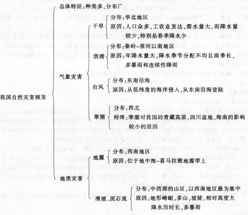 解析 (1)教学目标: ①知识与技能:能够准确说出我国几种常见的气象灾害和地质灾害的成因、分布和危害:知道我国自然灾害的主要特点。 ②过程与方法:通过展示图片和资料,加深我国自然灾害及造成损失的了解,了解我国是一个自然灾害频繁发生的国家;通过资料收集,加工整理各种地理信息,提高发现问题,综合分析问题和解决问题的能力。 ③情感、态度与价值观:关注我国自然灾害的现状与趋势,提高环境保护的意识,增强爱祖国、爱家乡的情感。 (2)教学过程: 【引入新课】我国地域辽阔,自然环境复杂多样,因而自然灾害种类多,分布广。 【自主探究】引导学生阅读课文和图2.48分析我国干旱灾害的分布和原因。 学生归纳总结: 分布:我国的干旱灾害主要分布在华北地区。 原因:华北地区人口众多,工农业发达,需水量大,而降水量较少,特别是春季降水少。 【自主学习】 (一)引导学生阅读图2.48分析我国其他的气象灾害(洪涝灾害、寒潮灾害、台风灾害)的主要分布地区以及发生的原因。 学生交流: 我国的暴雨洪涝多发生秦岭一淮河以南的地区,成因:年降水量大,降水季节分配不均且雨季长,多暴雨和连续性降雨。 我国的台风影响最严重的区域是东南沿海,成因:台风从低纬度的海洋侵入,登陆后逐渐减弱以至消失。 我国除青藏高原外大部分地区都会受到寒潮的影响。寒潮影响较为频繁的地区是华北、西北。 【迁移提升】结合寒潮影响的范围图分析:寒潮对我国的青藏高原、四川盆地、海南的影响较小的原因 【合作探究】学生交流:寒潮对青藏高原的影响较小的原因:海拔高;对四川盆地的影响较小的原因:北部的山脉阻挡了冬季风;对海南省的影响小原因:海南省纬度低。 (二)引导学生阅读图2.48分析我国的主要地质灾害(地震、泥石流、滑坡)的分布地区以及发生的原因。 自主学习完成: ①完成下列表格: ②完成活动1、2题。(学生交流) ③学生交流活动第3题。(谈一谈自己的看法) 学生交流:①地震灾害主要分布在西南地区,原因:位于地中海一喜马拉雅地震带上。 滑坡、泥石流主要分布在中西部的山区,以西南地区最为集中。原因:地形崎岖,多山,坡陡,相对高度大,降水历时长,多暴雨。 【迁移提升】学生阅读新闻材料“2013年7月全国因自然灾害直接损失千亿元”并思考。 【能力提升】总结:我国自然灾害总体的特征以及形成这种特征的原因。 (3)板书设计: