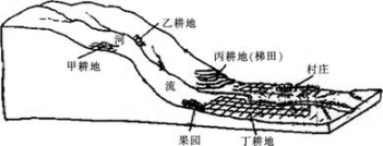 解析 丁耕地位于河流最下游,且地势最为平坦,故水源最充足,灌溉条件最为优越。