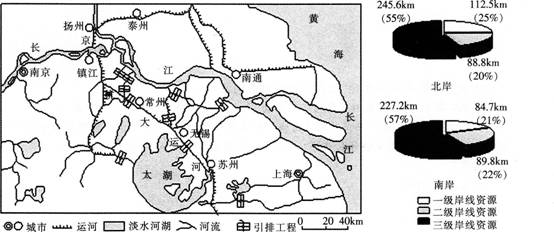 根据下列材料,回答下列问题。 材料一左图为长江下游部分地区略图。右图为长江江苏段岸线资源结构图。岸线资源包括港口和工业生产等所需的相关水域和陆域,一级...