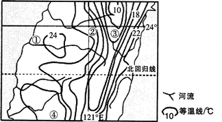 根据下图示意某地区年均温的分布。读图 图示①、②、③、④四地中,年降水量最少的是(  )。A.①地 B.②地 C.③地 D.④地