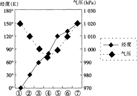 根据下图为“某月北纬310纬线上①~⑦7个地点的气压分布图”。读图 此时⑥所在地区的主要盛行风向为(  )。A.东南风 B.西北风 C.东北风 ...