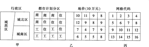 根据下图中的甲示意某城市行政边界的划分资料,该区有3个行政单元,分别为城西区、城北区和城南区。乙示意该地区都市计划分区与地价的网格式资料,丙是网格代码。人...