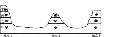解析 地点3缺失了乙层,且图中三个地层都有化石,说明是沉积层;则其过程可能是先经历沉积作用,然后地壳上升,使乙层被外力作用侵蚀掉,然后地壳再次下沉,又经历沉积作用形成丙、丁两层;故A正确。