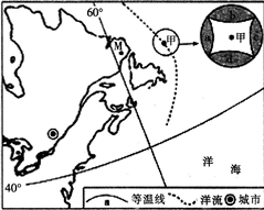 根据某圆形区域内由四条两两相互对称的等温线组成的图,因其极像古代的钱币,被称为古币型等温线图。下图为某陆地沿海洋流及其附近某海区古币型等温线分布图, ...