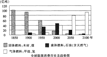 解析 由全球能源消费历史及趋势图可知,1900--2100年全球能源消费构成的变化特点是气体燃料的消费比重迅速上升。