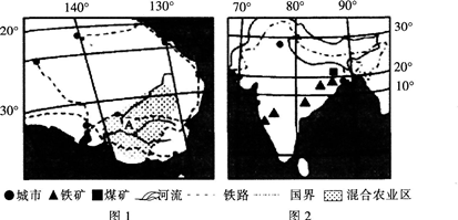 阅读材料,完成下列问题。? 材料一图1和图2分别为澳大利亚和印度略图。 材料二澳大利亚国土面积768万平方千米。澳大利亚十分重视提高畜牧业的科研水...