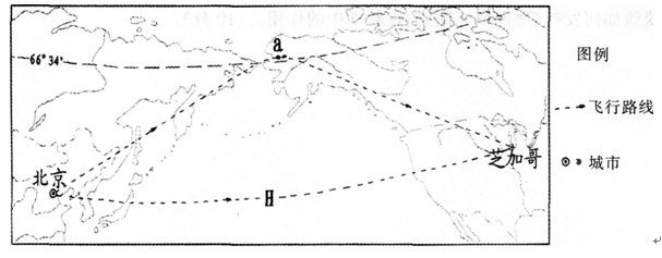 假设一架客机于北京时间6月22日12时从北京(116°E,40°N)起飞,7小时后途经a地(165°W,67°N)上空,14小时后抵达芝加哥(87.5°W...