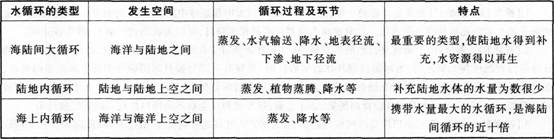 解析 知识点: ①水循环的定义。 ②水循环的类型。 ③水循环各个类型的形成过程和环节。 (2)【参考设计】 教学过程要点: 学生阅读课本内容并思考教师提出的探究性问题:①水循环联系了哪些圈层 ②水循环发生的空间领域有哪些 ③水循环的类型有哪些 ①水循环的定义 教师展示水循环示意图,请学生阅读后讨论并回答第一个问题。 学生回答:水循环联系了水圈、大气圈、岩石圈、生物圈四个圈层。 接着,教师引导学生得出水循环的定义:水循环是指自然界的水在水圈、大气圈、岩石圈、生物圈四大圈层中通过各个环节连续运动的过程。 ②水循环的类型 教师继续展示水循环示意图,请学生读图后思考、讨论,并回答第二个问题。 学生读图后思考、讨论,回答:水循环发生的空间领域有海洋与陆地之间、陆地与陆地上空之间、海洋与海洋上空之间。 教师肯定学生的回答,并引导学生得出水循环的类型:海陆间大循环、陆地内循环、海上内循环。 ③水循环各个类型的形成过程和环节 教师通过PPT上的三组动画分别演示各个类型水循环的演变过程并仔细讲解。 教师通过PPT展示三种水循环运动模式表格,并和同学们一起完成填表: 进行课堂练习,进一步巩固所学知识。 教师带领同学们在水循环示意图上回顾水循环三种类型的循环过程及环节,并请同学们思考水循环的意义。课堂小结:这节课我们学习了水循环的过程.我们知道了水是可以通过水循环运动进行补充、更新、再生的。但是水资源还是有限的,同学们都要树立节水意识,保护我们的地球家园。
