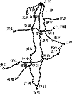 解析 从图上可以看出,京广高铁经过了北京、石家庄、郑州、武汉、长沙、株洲、广州等城市,由此可知影响京广高铁建设的主要因素是城市分布。