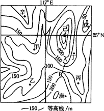 问题 根据读某地等高线图(比例尺1:20000), 如果在图中AB处修建水坝,坝长(图上距离0.7厘米)和最大坝高(坝顶到坝底)分别约为(  )。