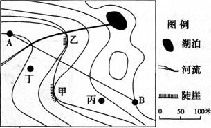 解析 河流是沿着山谷发育的,由此可知,图中东侧地势较高,西侧地势较低。瀑布一般形成于河流流经陡崖处,陡崖乙处有河流经过,可形成瀑布。瀑布适宜一定距离仰视,所以丁地是适宜观赏位置。