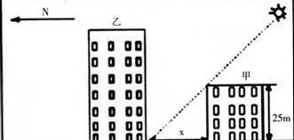解析 当地纬度为21°34′N,则当太阳直射南回归线时,该地太阳高度角达一年中最小值,因此当地的最小太阳高度角为90°一纬度差(21°34′+23°26′)=45°,利用正弦的余切值计算出楼间距与甲楼的高度相等,为25m。