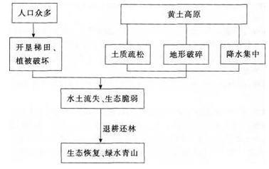 问题 下面是对我国黄土高原地理环境特征的一些描述,如水土流失、人口众多、退耕还林、降水集中、开垦梯田、植被破坏、生态恢复、土质疏松、地形破碎、生态脆弱、绿水青山等。 问题.(1)根据上述描述.用纲要信号方式(文字、线条或箭头等)绘制黄土高原地理环境特征变化过程的逻辑关系图。(6分) (2)简要说明运用该图进行教学的意义。(6分)