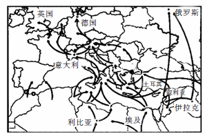 问题 下图为2015年8月~2016年3月涌入欧洲的难民迁移路径示意图。读图完成第下题。 此次涌入欧洲的难民主要来源地是( )。 ①北非 ②南亚 ③西亚 ④中亚
