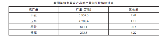 问题 区位熵又称专门化率,其值越高,地区产业聚集水平就越高,一般来说,当区位熵大于1时,则该地区的某项经济指标在全国有优势;当区位熵小于1时,则处于劣势。下表为我国某地区主要农产品的产量与区位熵统计表,读表完成第下题。 与塔里木盆地相比,该地棉花生产的优势条件是( )。