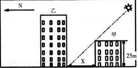 下图为某小区规划示意图,该小区位于21°34′N,拟在乙处建一新楼,为保证楼房一层全年均可采光,甲乙楼距X最小应是( )。 A.30m B.25...