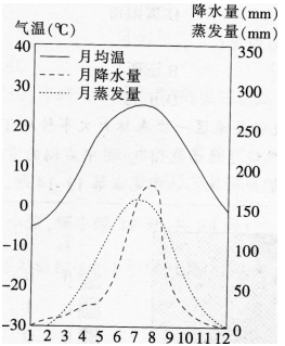 问题 下图是我国某城市气候资料图。图中的月蒸发量是指在给予充足的水分条件下,地表一个月可能产生的最大蒸发量。读图完成问题。 据图推断,该城市最可能是( )。