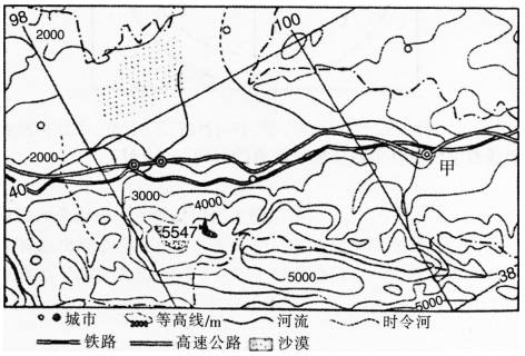 问题 图中甲地是优质瓜果生产区,交通建设发生了很大变化。 问题: (1)说明图中甲地利于瓜果生长的自然条件。 (2)描述图示区域铁路和高速公路的走向,并说明影响其走向的主要原因。