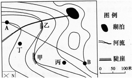 下图为某山地的局部等高线图(单位:米),等高距为20米,AB为空中游览索道。读图完成问题。 甲处为陡崖,其相对高度最有可能是( )。A.18米 ...