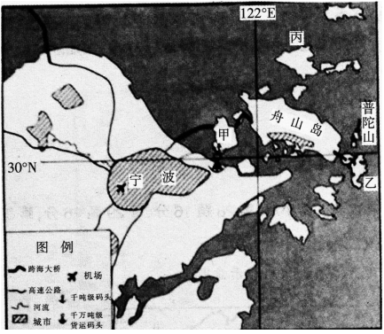 为推动现代海洋产业发展,浙江省着力建设功能多样的海岛,如港口物流岛、海洋生态旅游岛、海洋科技岛等。下图为浙江省部分区域分布图,读图完成问题。 与丙岛...