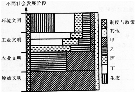解析 根据图示信息,从原始文明阶段到环境文明阶段的不同社会发展阶段中,甲要素所占比例逐渐减少。且在原始文明阶段占据除制度与政策外的所有要素,该要素应为土地;乙要素从农业文明阶段开始出现,且在所有要素中占比较大,此后占比逐渐减少,乙要素应为劳动力;丙出现于工业文明早期,丁出现于工业文明晚期。所以丙为资本,丁为科技。故本题选D。