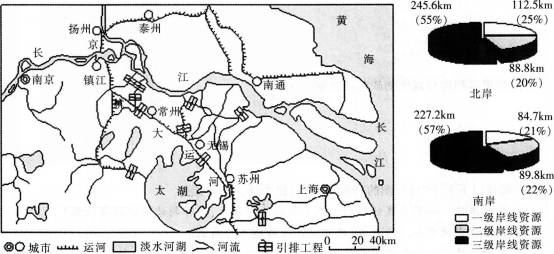 根据下列材料,回答下列问题。 材料一左图为长江下游部分地区略图。右图为长江江苏段岸线资源结构图。岸线资源包括港口和工业生产等所需的相关水域和陆域,一级...