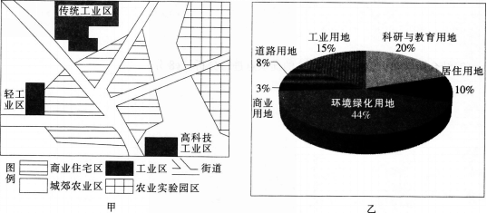 甲图是我国东部沿海地区某城市功能区分布略图,乙图为该城市某工业区土地利用统计图。读图回答题。 若甲图中城镇规划合理,避免了工业大气污染对住...