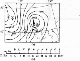 下图中(a)为某日08时海平面气压分布图(单位:百帕),(b)显示的是④地24小时内风的变化。读图,回答第题。 上图(a)中(  )。查看材料...