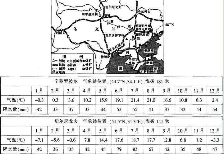 阅读材料,完成下列问题。 材料一乌克兰地区图及辛菲罗波尔和切尔尼戈夫两座城市的气候数据统计。 材料二乌克兰地处东欧平原南部.是世界三大黑土分布区之...