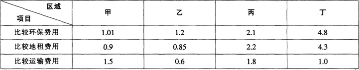 问题 比较费用,即一个区域某一生产要素相对于另一区域的该要素的比值。读甲、乙、丙、丁四地三种生产要素相对另一个参照区域的比较费用表 该公司决定建一原料导向型的加工厂,最好建在(  )。