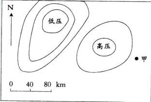 解析 读图文材料(天气系统的移动速度、比例尺)可知,该天气系统的移动速度较快,说明低气压势力较强:在30~48小时时段内。甲地分别位于低压槽的东侧和西侧,说明在该时段内甲地受势力较强的低压槽控制.故甲地可能经历强对流降雨天气。