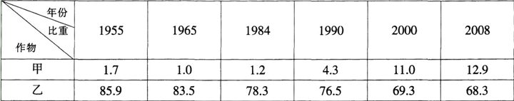 问题 读我国甲、乙两类作物在我国种植面积比重变化表(单位:%) 从甲、乙作物播种面积的变化可推测(  )。