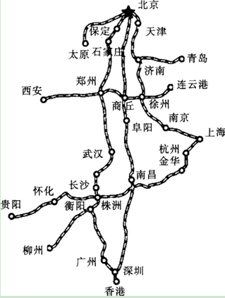 解析 从图上可以看出,京广高铁经过了北京、石家庄、郑州、武汉、长沙、株洲、广州等城市,由此可知影响京广高铁建设的主要因素是城市分布。