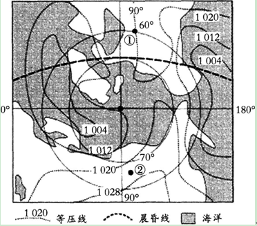 解析 依据等压线判定风向。 依经纬度及海陆轮廓可判定该区域为北极地区,依此时等压线的分布可看出①附近有一高压脊,且其东侧气压低,故水平气压梯度力为向东,北半球右偏,则①处的风向为西北风。