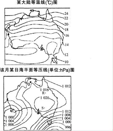 问题 读“某大陆等温线(℃)图”和“该月某日海平面等压线(单位:hPa)图”, 图中所示气温和气压状况最可能出现在(  )。