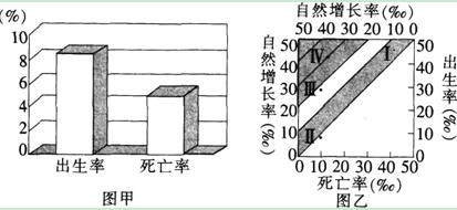 下面图甲表示“2010年我国东部沿海某特大城市人口出生率和死亡率的柱状图”.图乙为“我国不同阶段人口增长状况图”。读图 该城市在今后应(  )。 ...