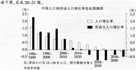 解析 从图中信息可知,我国人口增长率将在2036--2040年后出现负值,即出现严重的人口老龄化和劳动力不足的问题,针对上述问题,应适度调整人口生育政策,以缓解老龄化带来的问题,建立和完善社会养老服务体系,以解决老龄化人口过多带来的社会问题;着力发展自动化和促工业产业升级,以减少劳动力使用数量,而不能大力发展光纤制造业,因为该产业对劳动力需求量较多。