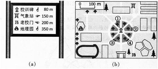 下图(a)为某校地理小组设计的校园景观指示牌,下图(b)为校园图局部。 指示牌在图(b)中的位置是( )。A.① B.② C.③ D.④