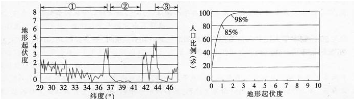 问题 地形起伏度是指在一个特定的区域内,最高点与最低点海拔高度的差值(数值为相对值,数值越大表示地形起伏越明显)。下面两图分别为“我国沿某经线的地形起伏度”和“我国不同地形起伏度上人口的累积分布”示意图. ①地形区为(  )。