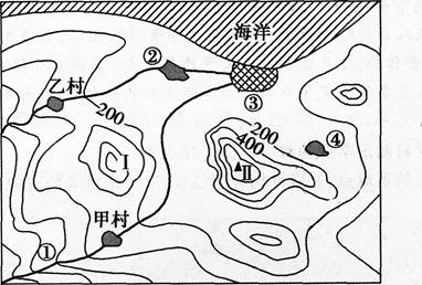 解析 图中等高距为200米,最高处在该区域的西南部,海拔在1 000—1 200米之间,乙村的海拔在200~400米之间,两地的高差在600~1 000米之间,B项正确。