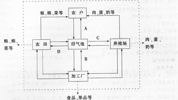 问题 阅读下列材料,完成(1)--(3)题。 材料一北京郊区留民营村走出了一条生态农业的可持续发展路子。留民营村建设生态农业所采取的主要措施:①调整产业结构,变单一的农业为农、林、牧、副、渔五业并举;②实行综合循环利用;③开发利用沼气、太阳能等新能源。目前,留民营村已步入区域化种植、规模化经营、清洁化生产的良性发展轨道,它已成为我国农业可持续发展的典型代表。 材料二下图是留民营村生态农业综合循环利用简图。 (1)根据关联图,将原料、饲料、燃料、肥料填入字母后面的横线上。 A_____B_____C_____ D_____ (2)以材料1和材料2为教学内容,设计知识与技能和情感、态度与价值观目标。 (3)在(1)、(2)的基础上,设计该内容的教学流程并说明设计意图。(要求:能体现学生自主学习的特点)