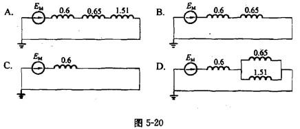 220kV线路(如图5-19所示)K点发生三相短路。电源、线路电抗标么值已注明在图中,额定电压为220kV,基准容量为1000MVA。 图5-20...